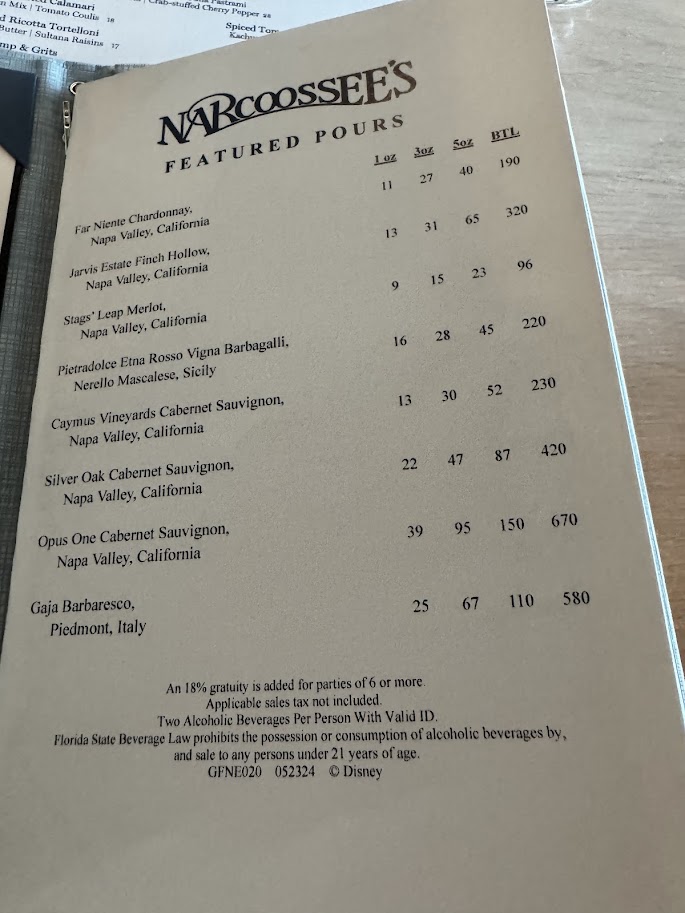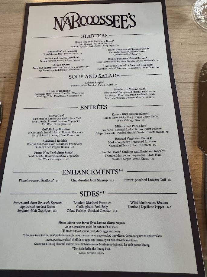 While business casual attire is suggested many guest come right from the park. Narcoossee’s is especially easy to access from the ferry so if you’re not staying at the Grand Floridian you can easily take the ferry from the Magic Kingdom to the Grand Floridian resort and then the restaurant is right on the left.
