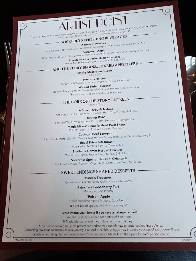 Story Book Dining at Artist Point is a character dining experience tucked away in the lobby at Disney’s Wilderness Lodge Resort featuring two of your favorite dwarves, Snow White , and The Queen.